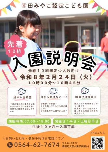 *予約制とさせていただきます。0563-52-2231 ながら幼稚園までお電話ください。お待ちしております。