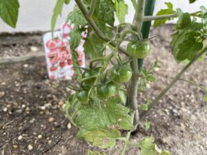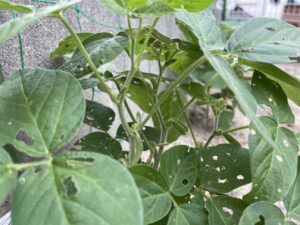 枝豆になるであろう小さな枝豆ができ、トマトには緑の実がなりました。