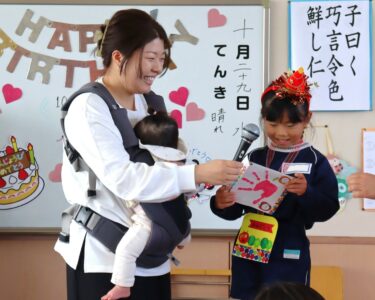 3人とも女の子のお友達で、みんなの前に出てくると緊張している様子でしたが、誕生日メダルとカードをお友達からプレゼントしてもらい、とっても嬉しそうでした。