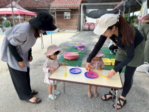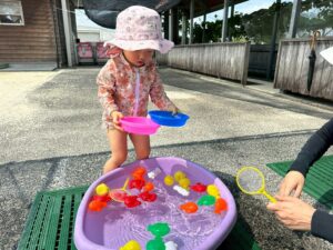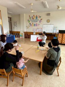 子育てひろば「はっぴー」です。8月はシャボン玉や魚すくい、感触あそびをして楽しみました。