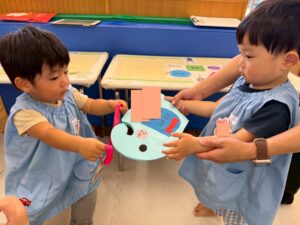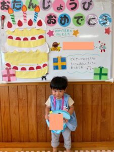 同じクラスのお友達から、誕生日メダルと誕生日カードをプレゼントしてもらい、嬉しそうにしているバースデーボーイでした!