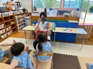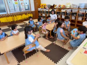 お誕生日のお友達、先生に「〇〇さ〜ん!」と呼ばれると、手をピンピンに伸ばして返事をしてくれました!