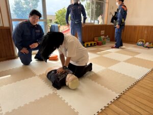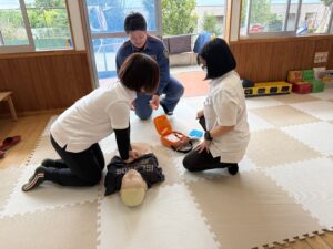 今回の心肺蘇生やAED使用では、消防署からみやこ乳児園まで救急隊の方が向かう時間を想定し、1人2分心肺蘇生を行いました。(交代しながら計6分ほど)
