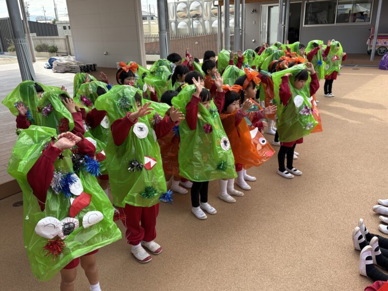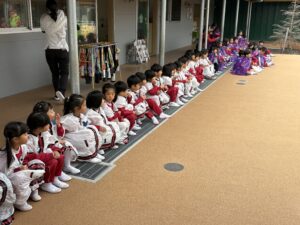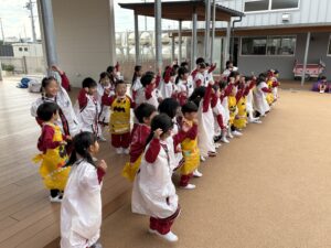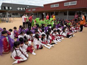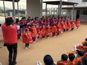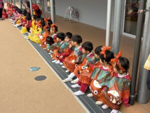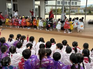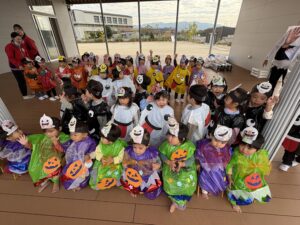 今年のハロウィンパーティーはいつもと一味違っていました。各学級が工夫した手作りの衣装を着て、みんなの前で踊りました。その後は定番のお菓子をもらうコーナーです。みんな元気よく「トリックオアトリート」と言い、先生たちからお菓子をもらいました。