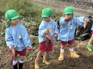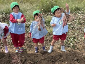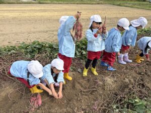 29日(水)にみんなでサツマイモ掘りに行きました。試し掘りをしたときはほとんどできていなく、焼き芋パーティーができないと心配しました。でも、みんなで掘ってみると例年の半分ぐらいの出来でしたが、なんとかサツマイモ掘りができました。