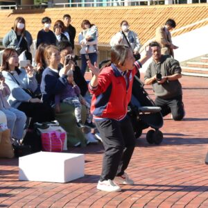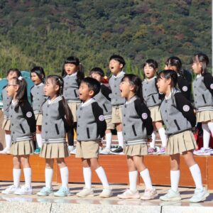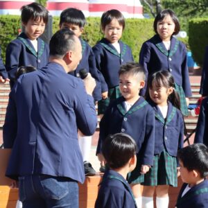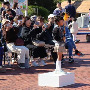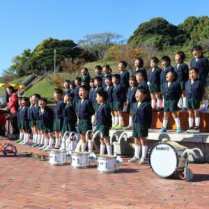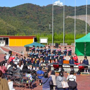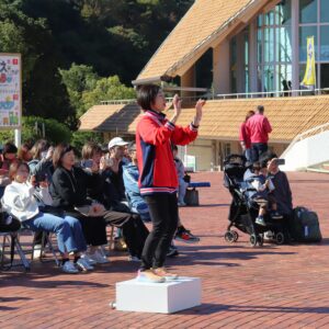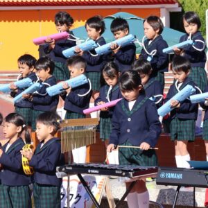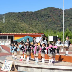 あいちこどものくにの あおぞらステージで はずみやこようちえんの おともだちと よしだみやこにんていこどもえんの おともだちが わくわく あおぞら はっぴょうかい
