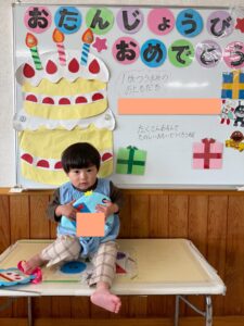 まず初めは先生やお友達から誕生カードとメダルのプレゼントです。