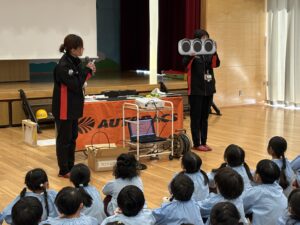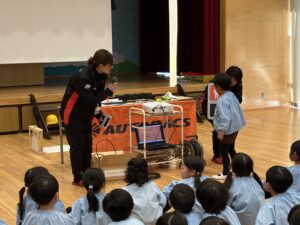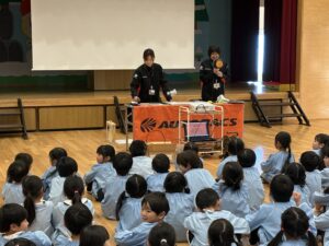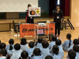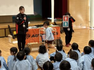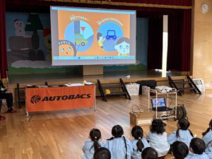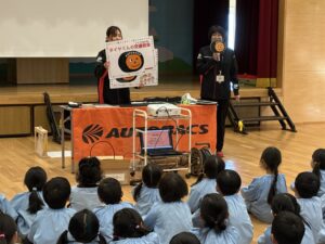 今日はオートバックスという自動車関連会社の方がみやこ幼稚園で交通安全教室をしていただきました。